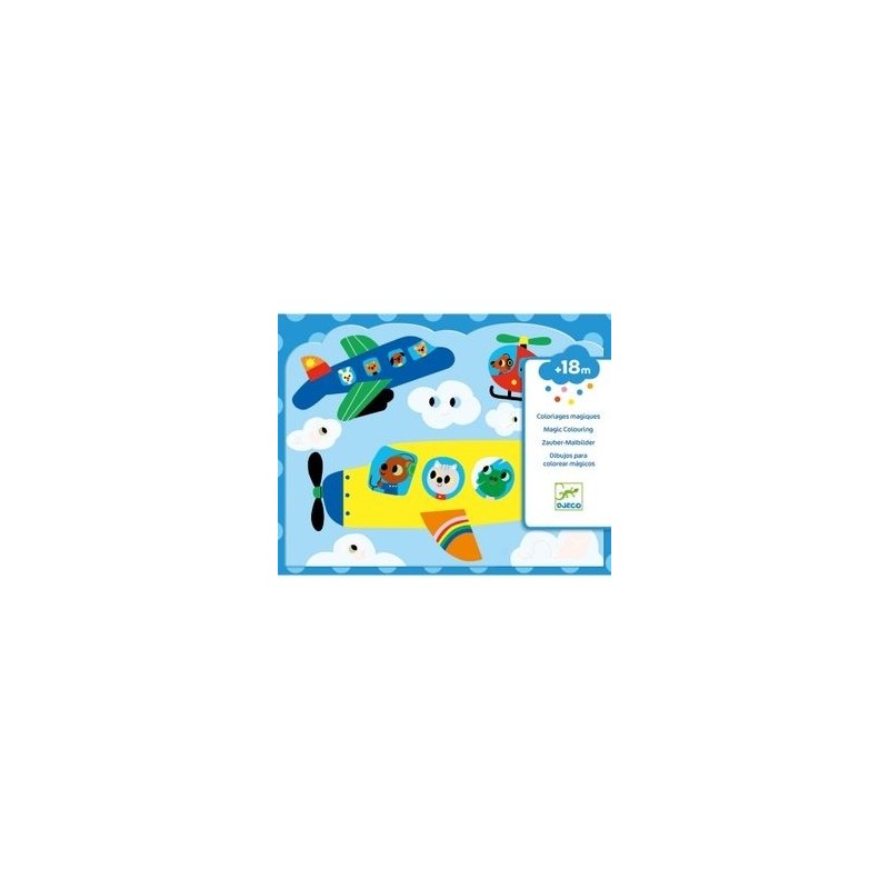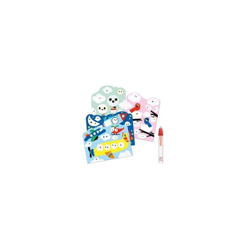 Une pochette de coloriage à l'eau adaptée pour les enfants, dès 18 mois. L'enfant colorie à l'aide du crayon à eau les parties blanches pour découvrir ce qui se cache dans le ciel. C'est magique : des motifs apparaissent et changent de couleurs ! Les planches sèchent et l'enfant recommence !