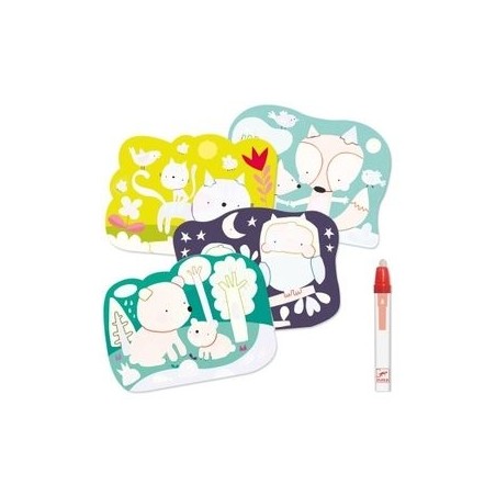 Contenu : 4 planches illustrées en plastique souple avec une zone blanche qui disparait, un crayon à reservoir d'eau et 1 support en carton épais.