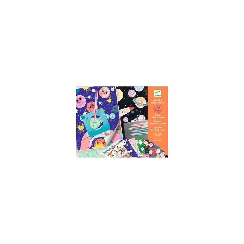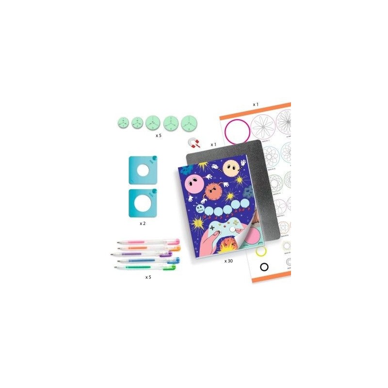 Un coffret de dessin pour réaliser de superbes spirales colorées et ainsi compléter les planches proposées dans ce bloc de 30 pages dont les illustrations couvrent 10 thèmes différents. Une activité classique revisitée par Djeco grâce à des outils astucieux qui permettent de réaliser les spirales sans bouger ! L'enfant pose sa feuille sur la plaque de métal, puis applique le cadre aimanté dans lequel il insère la roue crantée. Muni de son stylo, il décrit des cercles pour dessiner facilement sa rosace sans avoir à maintenir le cadre en place.