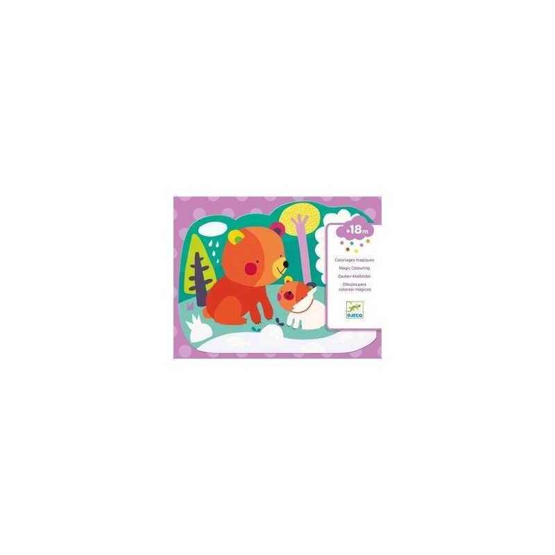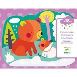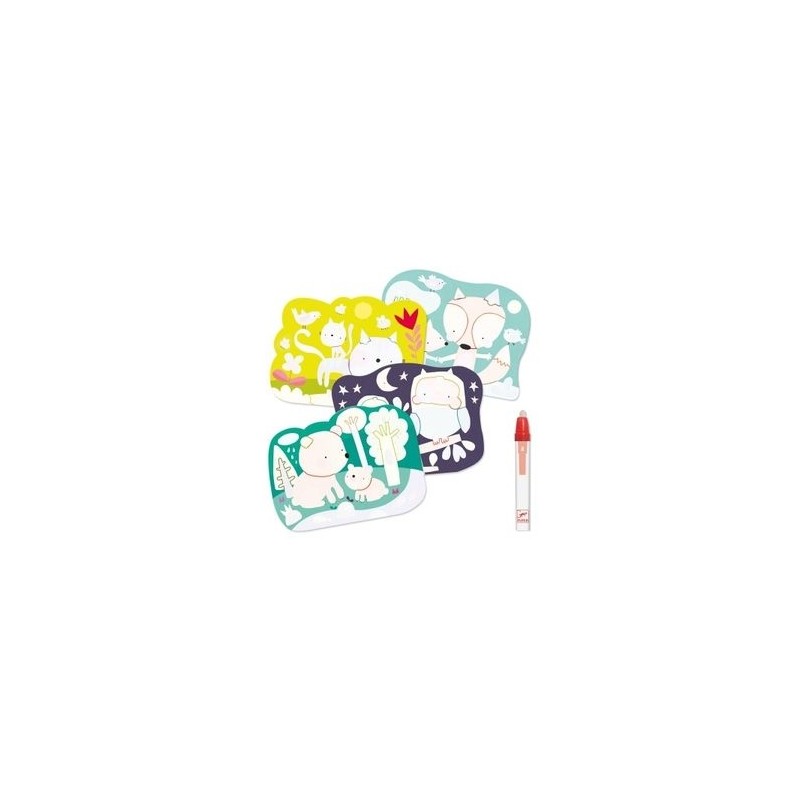 Contenu : 4 planches illustrées en plastique souple avec une zone blanche qui disparait, un crayon à reservoir d'eau et 1 support en carton épais.