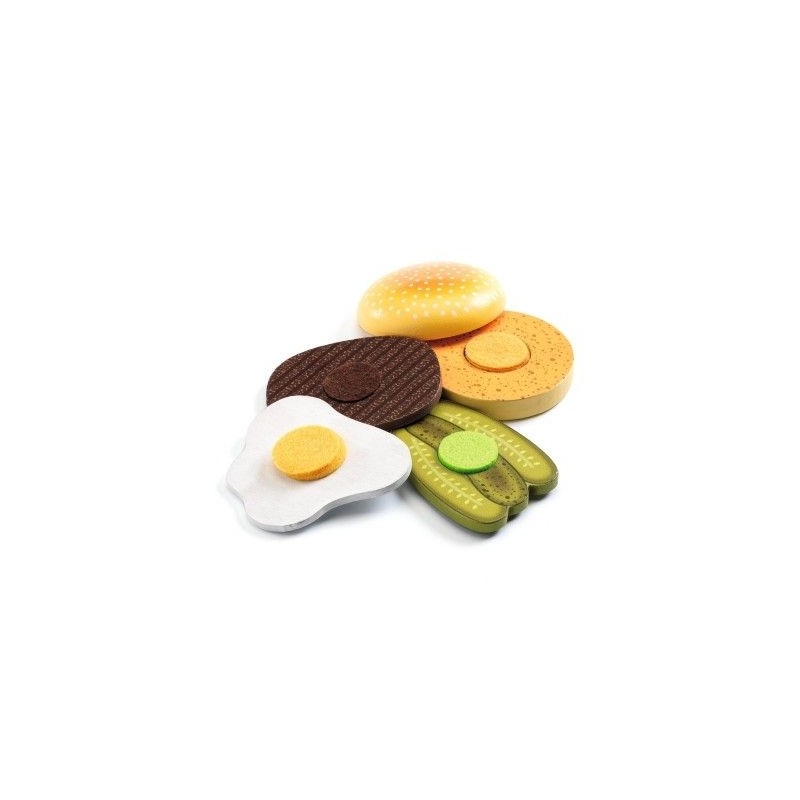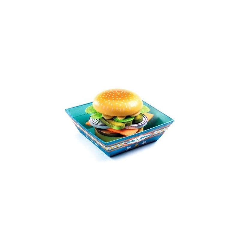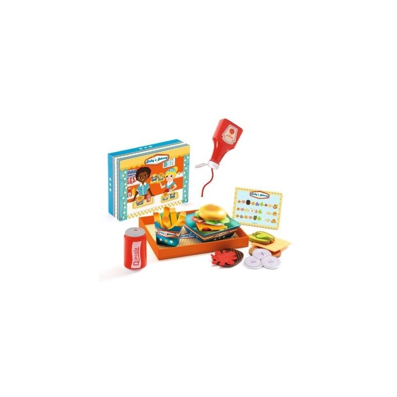 Dans cette jolie boîte en bois, tous les accessoires nécessaires pour préparer trois délicieux hamburgers. L'enfant compose les hamburgers comme il le souhaite ou suit les suggestions de la carte menu. Il n'y a plus qu'à déguster !