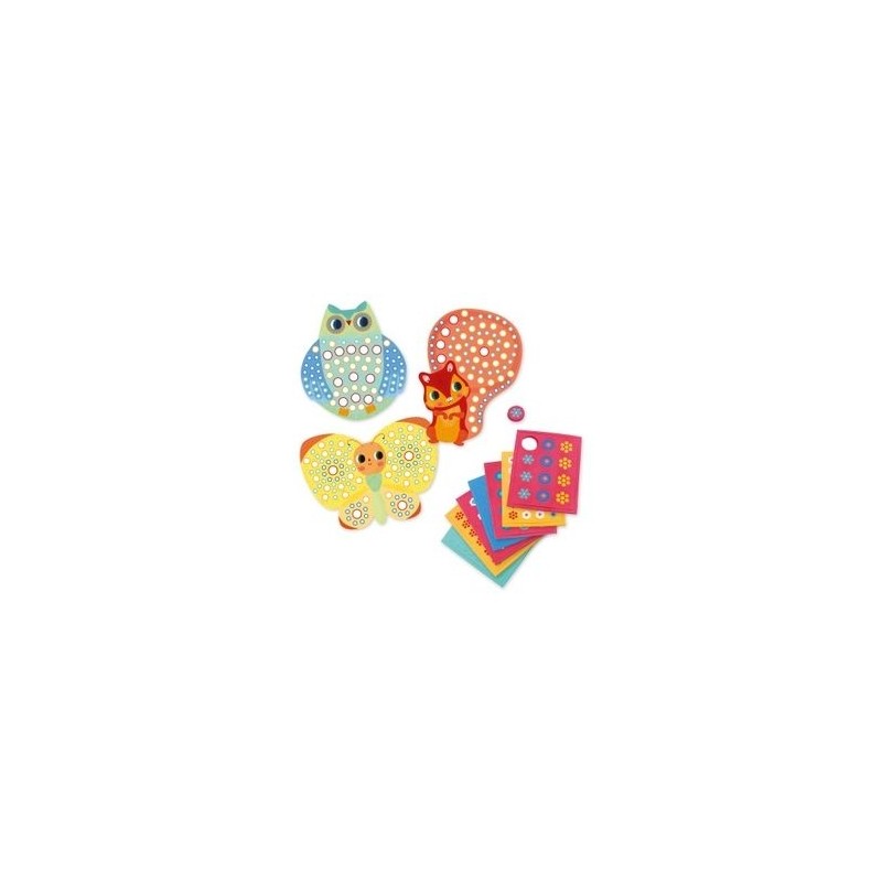 Contenu : 3 cartes animaux silhouettées à compléter de 26 x 17 cm (1 papillon, 1 écureuil et 1 chouette), 10 planches de ronds en mousse à coller (3 diamètres différents), unis et imprimés, et 1 livret explicatif pas à pas.
