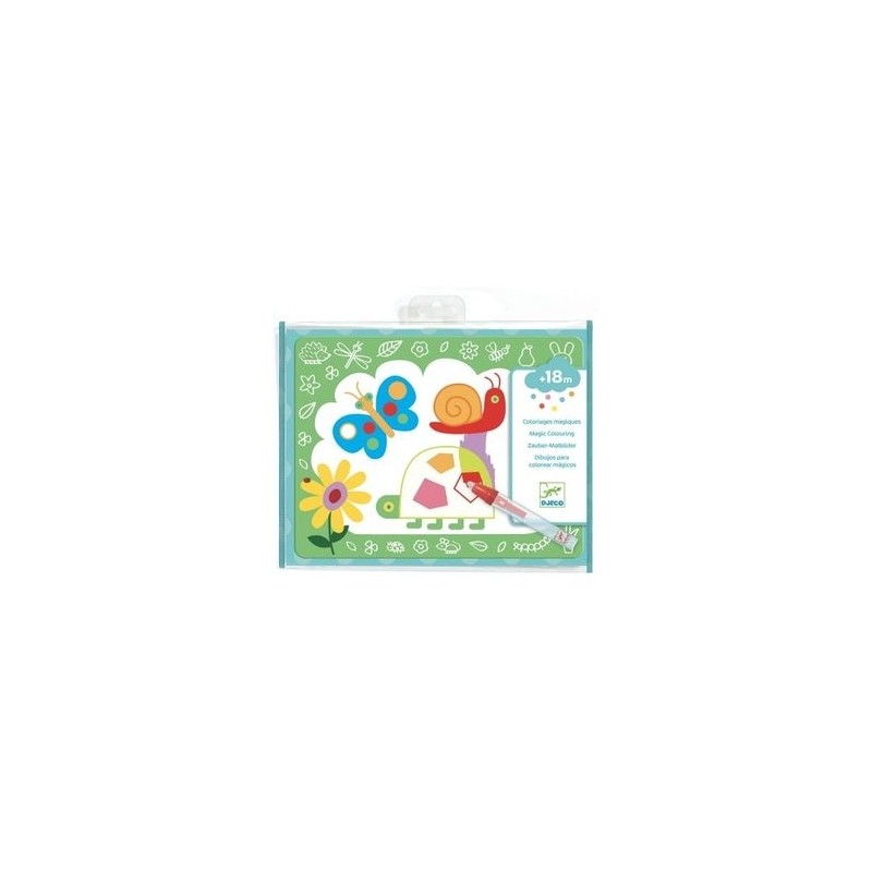Une pochette de coloriage à l'eau adaptée pour les enfants, dès 18 mois. L'enfant colorie à l'aide du crayon à eau les parties blanches pour découvrir ce qui se cache dessous. C'est magique : des motifs apparaissent ! Les planches sèchent et l'enfant recommence !