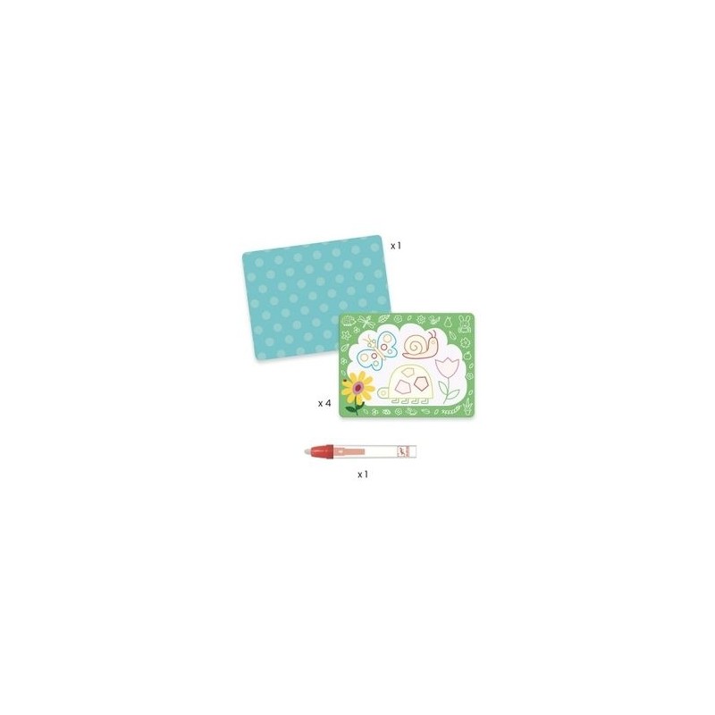 Contenu : 4 planches illustrées en plastique souple avec une zone blanche qui disparaît, un crayon à réservoir d'eau et 1 support en carton épais.