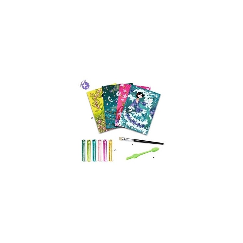 Contenu : 4 cartes imprimées et préencollées (15 x 21 cm), 6 tubes de paillettes, 1 outil plastique, 1 pinceau brosse et 1 livret d'explications pas à pas en couleurs.