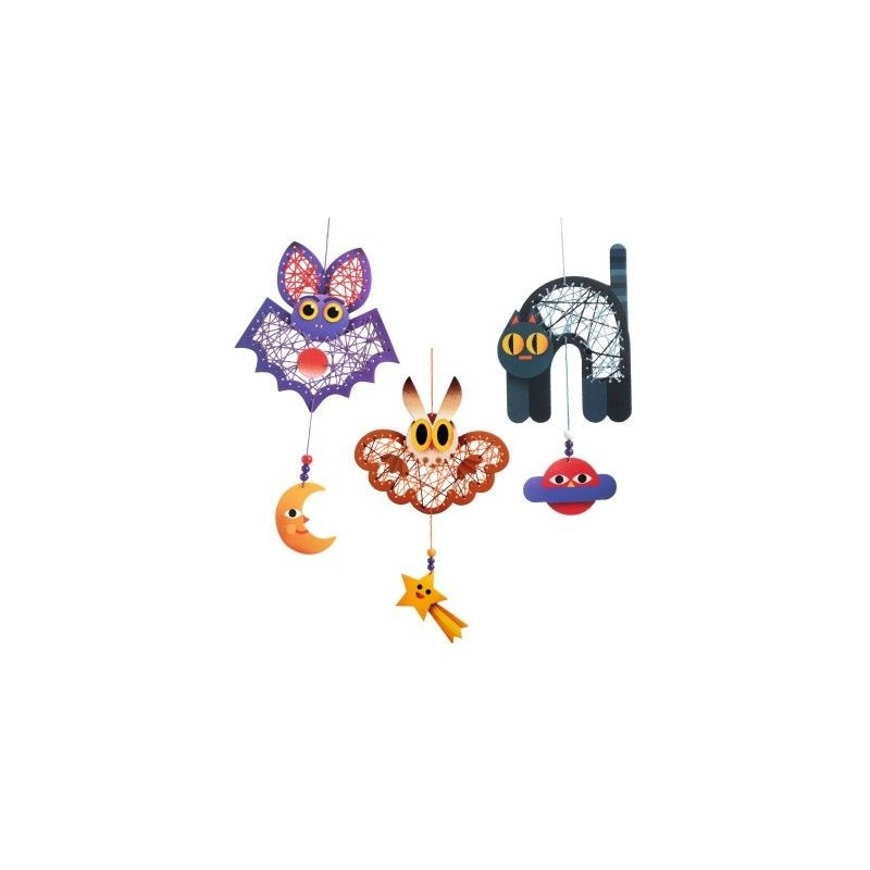 Un kit pour créer 3 suspensions décoratives « nocturnes ». À l'aide de l'aiguille à bout rond, l'enfant glisse les fils dans les cartes perforées et les croise jusqu'à donner corps aux personnages à compléter. Il vient finaliser ses créations en ajoutant des pendentifs avec des perles en bois.