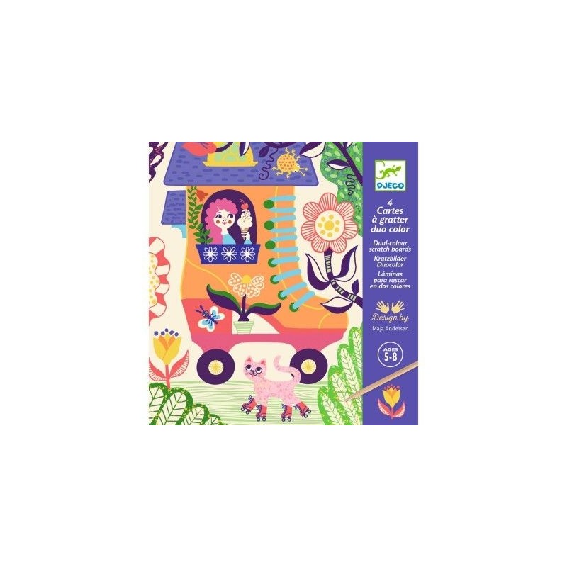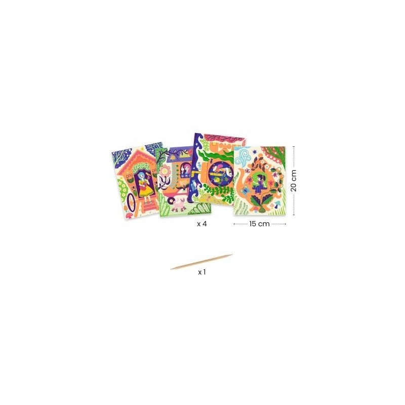 Contenu : 4 cartes à gratter (15 x 20 cm), 1 stylet en bois double pointe, 1 livret explicatif pas-à-pas en couleurs.