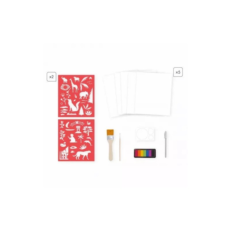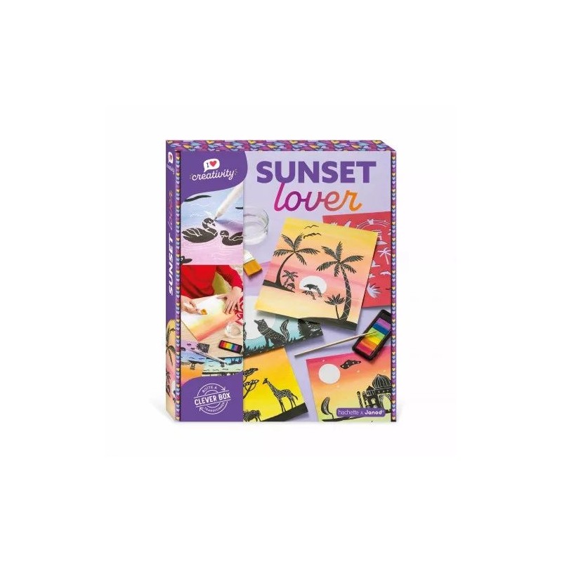 Les couchers de soleil, tout le monde adore, alors pouvoir créer ses propres ambiances dégradées à l'aide de peinture, c'est génial ! Ce coffret créatif permet aux enfants à partir de 8 ans de réaliser 5 tableaux avec un fond coucher de soleil et des dessins de silhouettes noires en premier plan. Alors c'est parti grâce au guide d'utilisation, aux 2 pinceaux, à la palette de 7 couleurs aquarelles, aux 2 planches de pochoirs et au stylo blanc qui permet d'ajouter des détails sur les silhouettes noires. Malin avec la Clever Box, on peut transformer la boite du kit en cadre pour une des réalisations ! Il faut compter entre 6h et 7h30 pour finaliser les 5 tableaux. Cette activité développe la créativité et la motricité fine. Elle fait partie de la gamme I Love Creativity qui donne aux plus grands toutes les clés pour exprimer leur créativité !