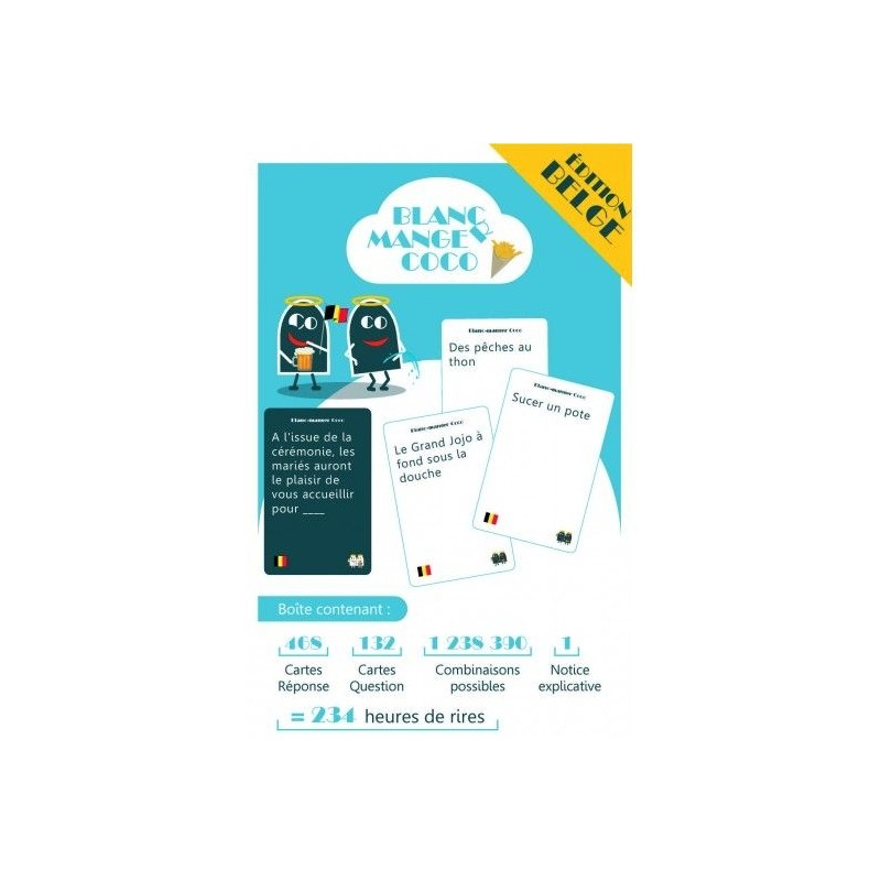 Blanc manger Coco est un jeu de cartes idéal pour l'apéro entre amis. Il est composé de 134 cartes « questions » et 466 cartes « réponses » pour une infinité de combinaisons croustillantes.