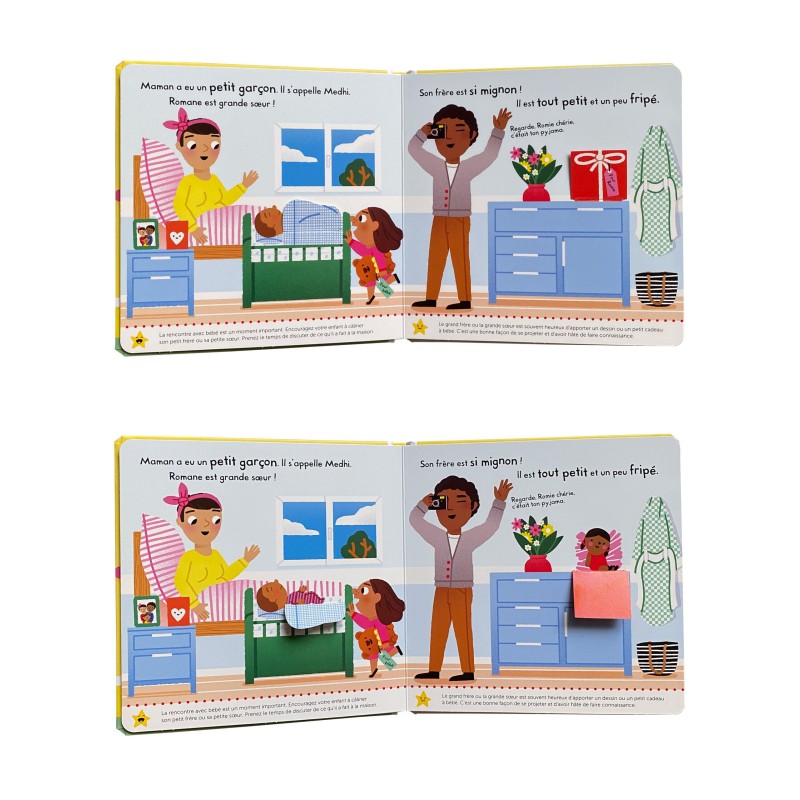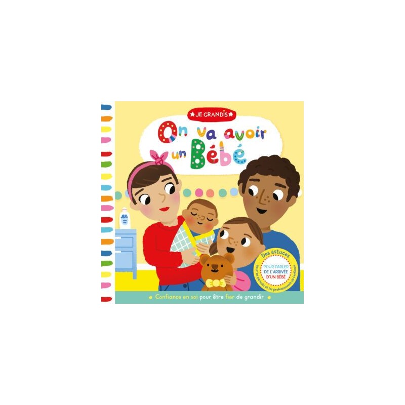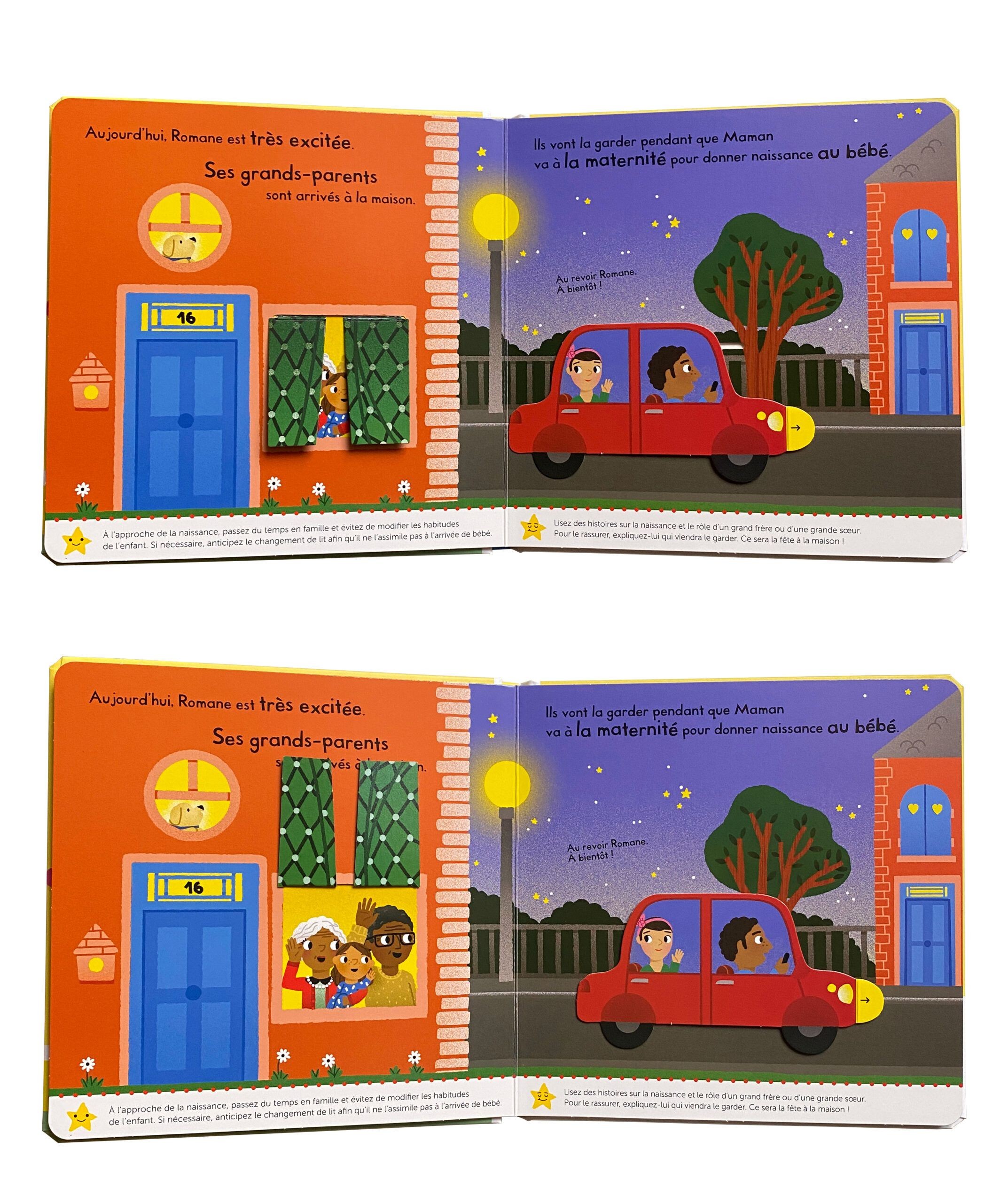 Romane va devenir grande sœur, Papa et Maman l’aident à se préparer à l’arrivée de bébé. Quand Maman part à la maternité, ses grands-parents viennent la garder, puis elle accueille son petit frère à la maison… Une histoire très tendre pour parler aux tout-petits de l’arrivée d’un bébé. La collection “Je grandis” éveille les tout-petits aux apprentissages importants, avec des conseils rédigés par des professionnels de la petite enfance. Chaque livre comporte des volets à soulever et une roue à tourner pour favoriser la découverte et développer la motricité fine. Une collection idéale pour développer sa confiance en soi et être fier de grandir.