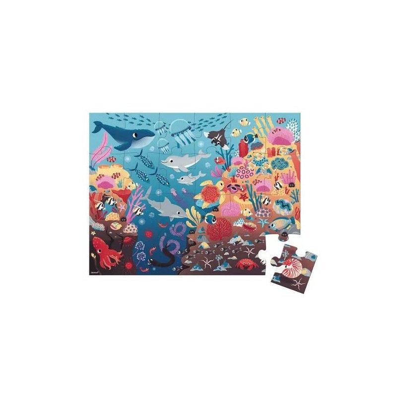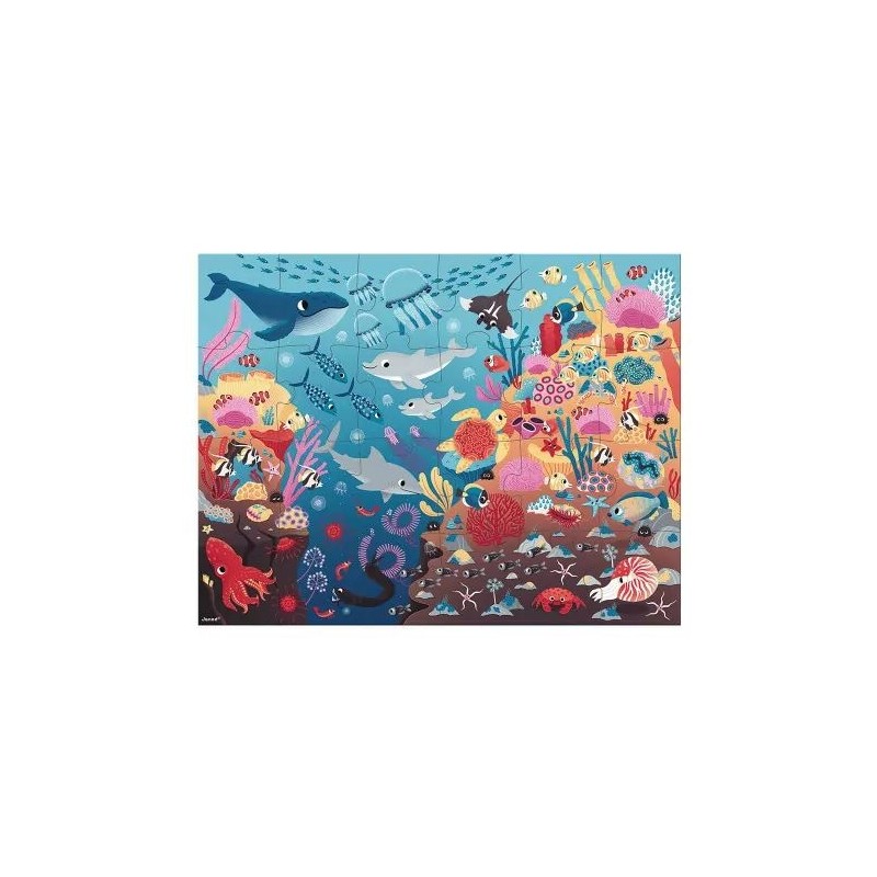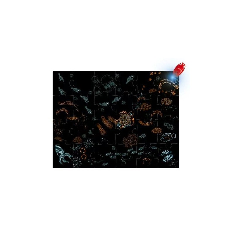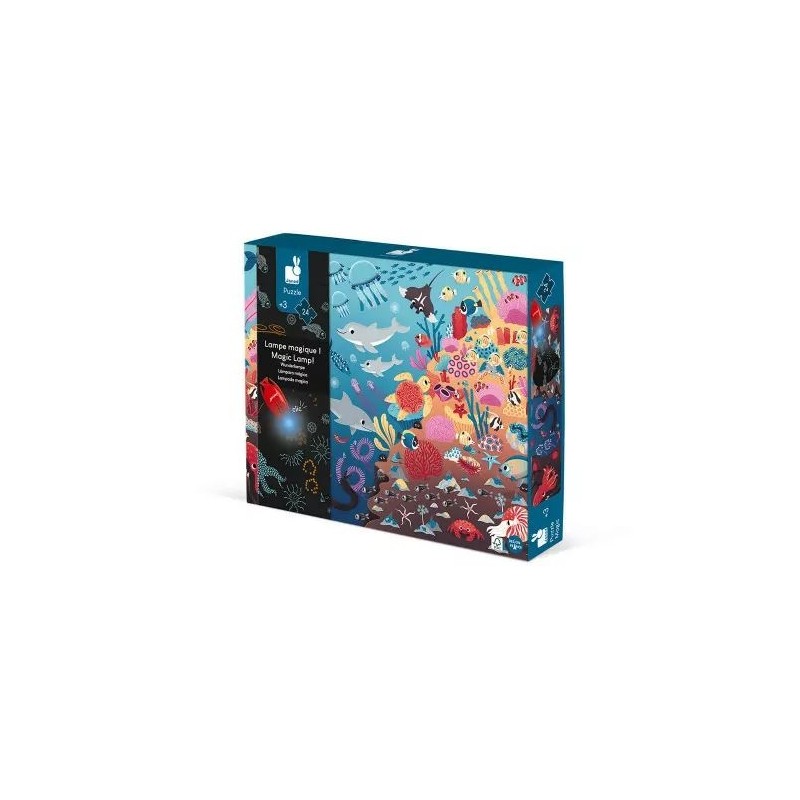 Voici un puzzle d'un genre nouveau qui va impressionner les enfants ! Pourquoi ? Parce qu'il est magique ! Ce puzzle de 24 pièces permettra aux enfants à partir de 3 ans de partir à la découverte des fonds marins grâce à une lampe spéciale qui révélera plein de détails cachés ! Prêt pour explorer les profondeurs ? Alors, on commence par reconstituer ce puzzle aux couleurs douces puis on allume la petite lampe magique fournie pour espionner pieuvres, anémones et méduses dans leur vie nocturne ! De nouveaux éléments apparaissent dans des tons bleus et jaunes ! Les pièces sont grosses pour faciliter la prise en main même pour les tout-petits. Cet incroyable puzzle 2 en 1 éveillera la curiosité des enfants qui voudront en savoir plus sur chacun des habitants des abîmes découverts grâce à la lampe ! Un poster sert de modèle pour aider les plus petits. Ce produit est composé de matériaux certifiés FSC® et de matériaux contrôlés.