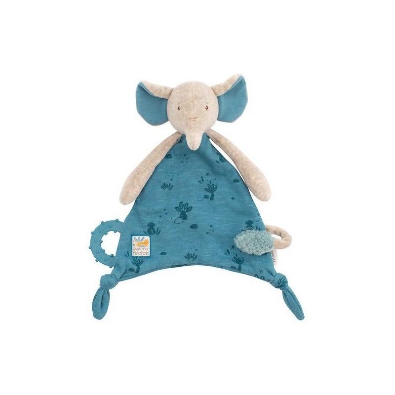 Doudou Bergamote l'éléphant et ses grandes oreilles toutes douces. Il comprend une queue à transformer en attache tétine à scratcher, et un anneau dentaire sur le côté. Le prénom de bébé pourra être brodé sur la combinaison de son nouveau compagnon.