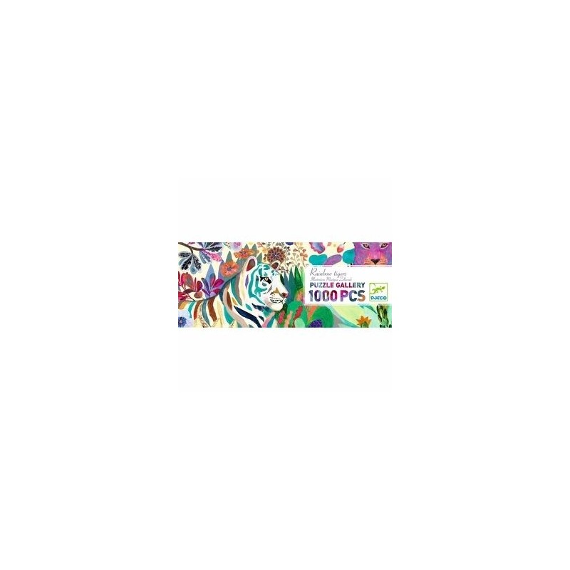 Rainbow Tigers est un puzzle gallery de 1000 pièces représentant des tigres arc-en-ciel dans une jungle colorée. Carte blanche donnée aux illustrateurs dans un format inédit tout en longueur ! Une façon ludique et originale de sensibiliser les enfants à la peinture.