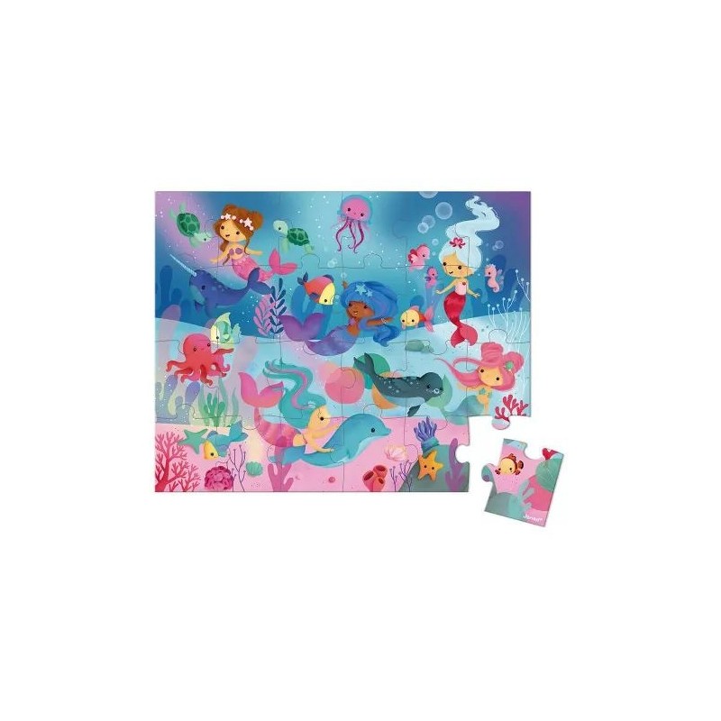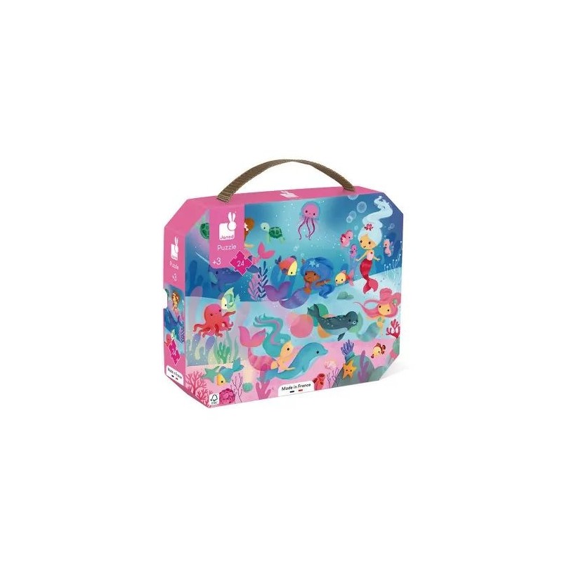 Puzzle carton de 24 pièces sur le thème des sirènes. Dans sa jolie valisette, ce puzzle sera facile à transporter grâce à sa poignée en tissu. Contient un poster servant de modèle pour les débutants, les plus aguerris pourront ensuite réaliser le puzzle en toute autonomie. Fabriqué en France.