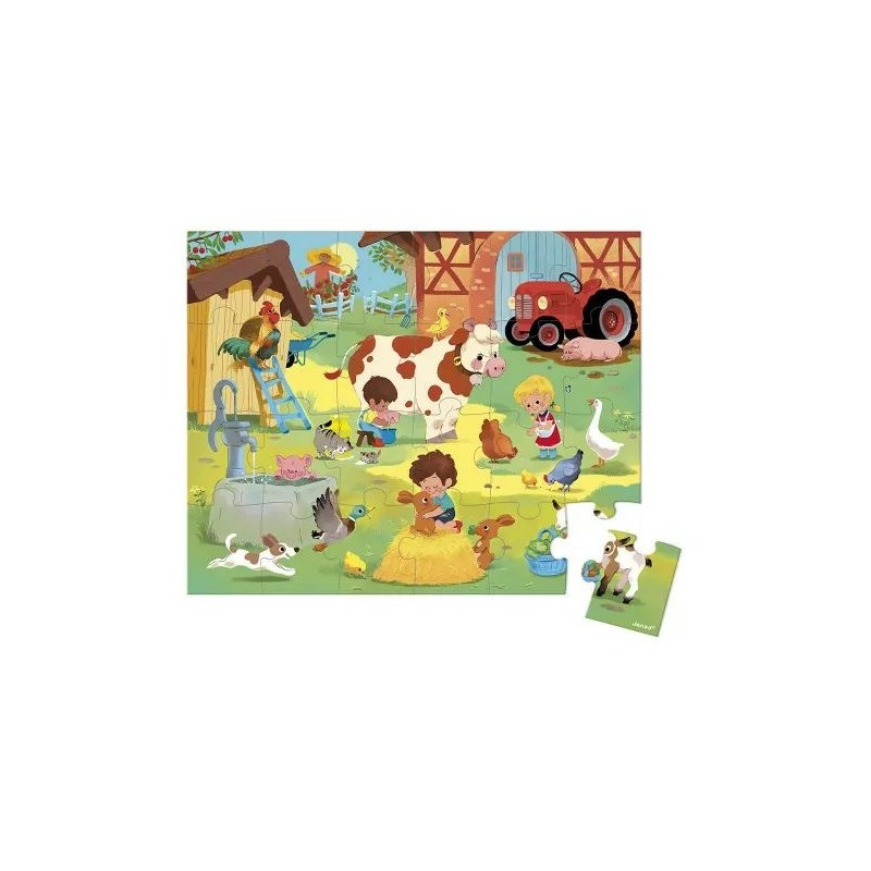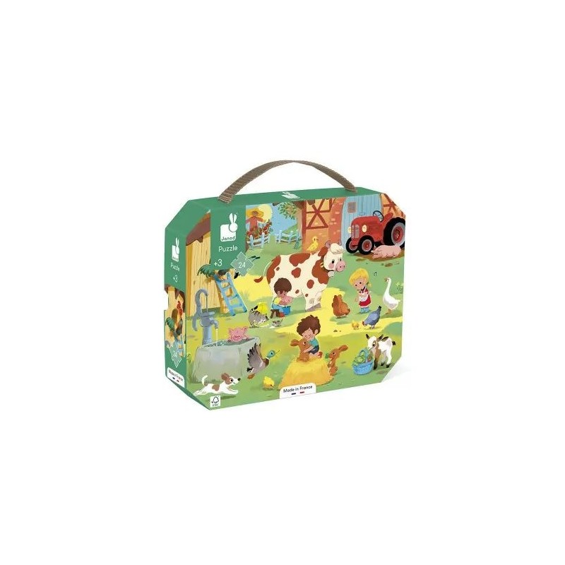 Prêts pour une sortie à la ferme ? Un tracteur, une foule d'animaux et beaucoup de détails rigolos attendent votre enfant pour une activité amusante et ludique ! Retrouvez les animaux de la ferme dans ce puzzle en carton de 24 pièces. Les pièces sont adaptées aux mains des enfants dès 3 ans, pour une manipulation facile ! Quel est cet animal ? Que font les petits lapins ? Un support ludique pour développer la mémoire et la dextérité des petits. Ce puzzle plein de vie est livré avec un poster servant de modèle, pratique pour recomposer le puzzle à son rythme ! Livré dans une jolie valisette avec poignée, pour un rangement des pièces et un transport faciles. Cet adorable puzzle est fabriqué en France. Décoré à base d'encres végétales, ce puzzle promet de longues heures d'amusement !
